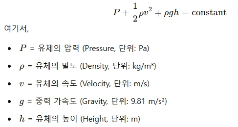 - 이 식은 유체의 에너지가 압력, 속도, 높이의 세 가지 형태로 존재하며, 이들의 합이 일정하게 유지됨을 의미합니다.